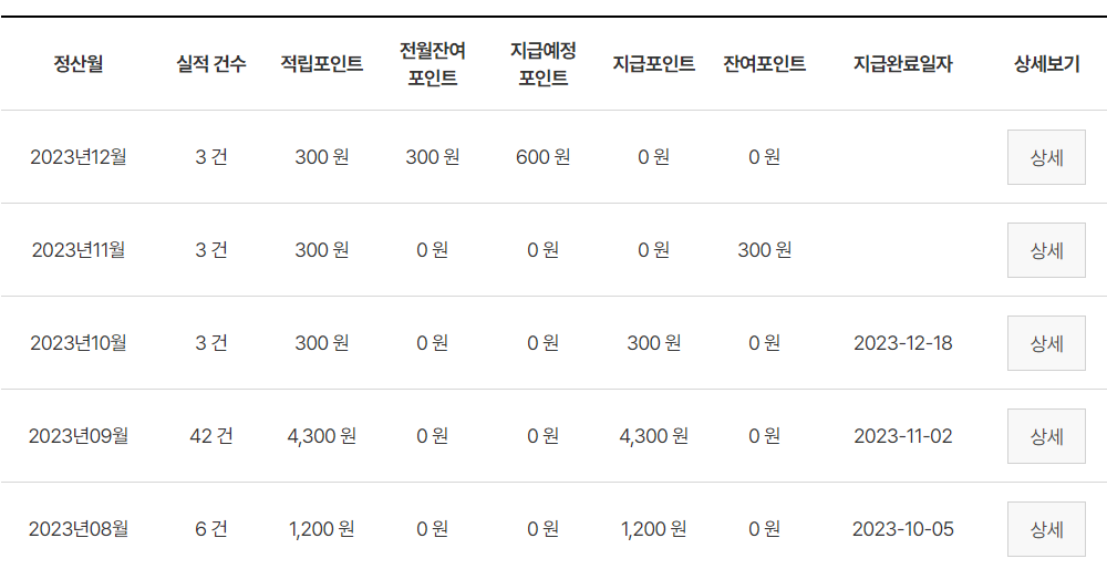마이페이지에서 현황 조회가 가능한데, 저 금액을 월별로 얼마씩 포인트가 쌓였고 얼마나 지급될 예정인지 모두 확인하실 수 있습니다.