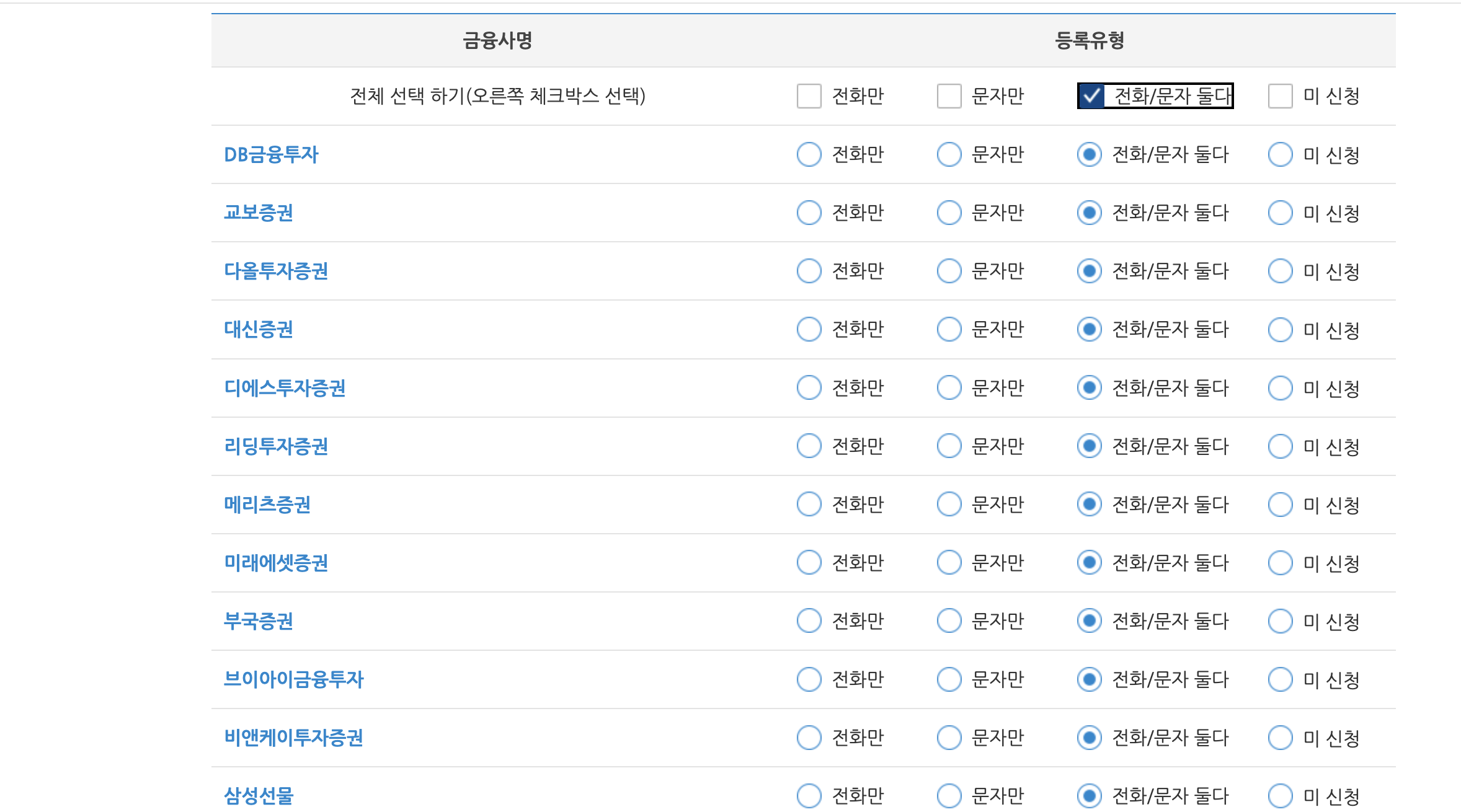 그러면 은행사부터 증권사, 보험사, 카드사 등 차단할 수 있는 리스트들이 쫙 나옵니다. 여기서 전화, 문자를 차단할 수 있는데 전화/문자 둘다에 체크를 해주고 등록하시면 됩니다. 여기서 신청을 해놓고 추후에 철회등록을 할 수 있으니 너무 고민하진 않으셔도 됩니다.