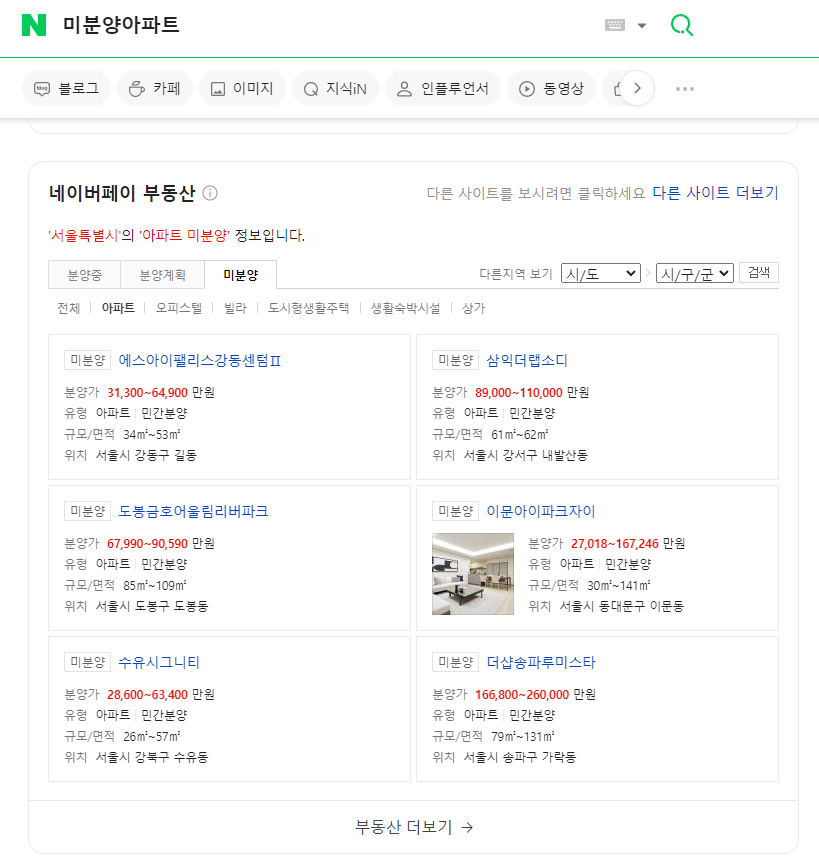 전국 미분양 아파트를 찾아보고 싶다면, 네이버 검색으로 알아볼 수도 있습니다. 검색창에 미분양 아파트를 검색하면 네이버페이 부동산이 상단에 나오는데, 우측 상단에 '다른지역 보기'에서 원하는 지역을 고르고 검색해 보면 미분양된 주택 리스트가 나옵니다.