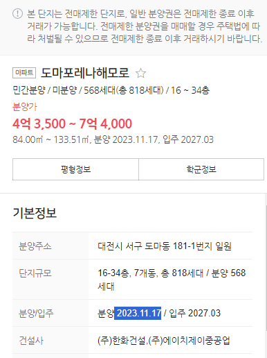 그럼 이 주택이 2년 동안 분양이 안된 주택인지 알아봐야 할텐데요. 리스트로 나온 주택 중 하나를 선택해 들어가보면 분양/입주 날짜 정보를 확인할 수 있습니다. 이 정보를 확인해서 전략적으로 주택 구입 계획을 세워 볼 수 있겠죠.