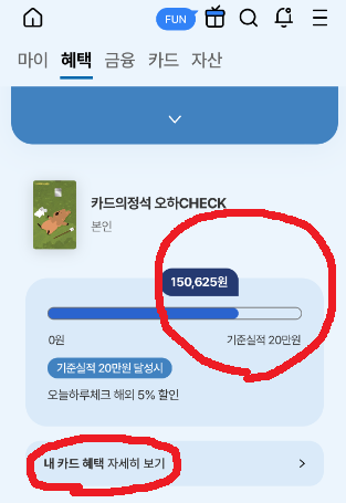 우선 앱이 굉장히 느린 편입니다. 카드 실적이나 혜택, 이용금액을 살펴보기 위해 자주 앱에 들어가게 되는데 현대/삼성 카드 앱에 비해 로딩이 굉장히 길게 느껴졌습니다. 그리고 앱 홈화면에서 내가 지금까지 얼마나 이 카드로 결제했는지 바로 확인할 수가 없습니다.